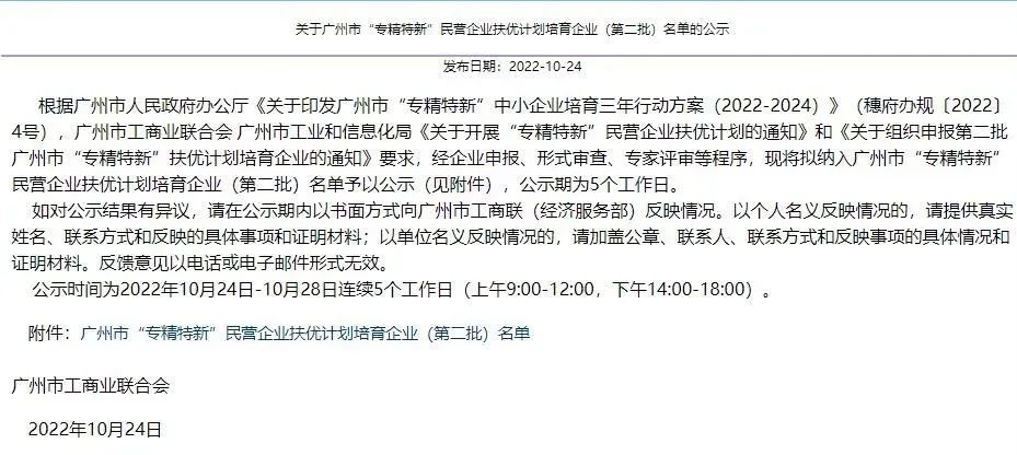 近期,根據廣州市人民政府辦公廳《關于印發(fā)廣州市“專精特新”中小企業(yè)培育三年行動方案(2022-2024)》(穗府辦規(guī)〔2022〕4號),廣州市工商業(yè)聯合會、廣州市工業(yè)和信息化局《關于召開“專精特新”民營企業(yè)扶優(yōu)計劃的通知》和《關于組織申報第二批廣州市“專精特新”扶優(yōu)計劃培育企業(yè)的通知》要求,經企業(yè)申報、形式審查、專家評審等程序,《廣州市“專精特新”民營企業(yè)扶優(yōu)計劃培育企業(yè)(第二批)名單》予以公示。