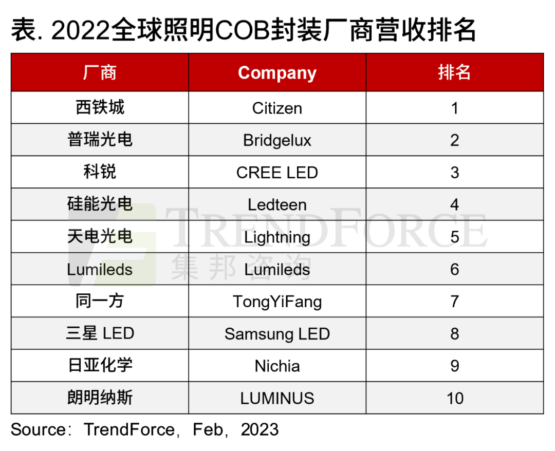 2022全球照明COB封裝廠商營收排名發(fā)布